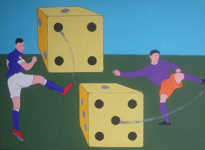 Fußballer würfeln [für die Einrichtung eines „Gänsespiels“ im Freien beim Behindertenheim „Contada dell’oca“ in Fanna bei Pordenone, Venetien] |